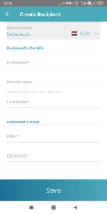 Masukkan nama penerima uang. Masukkan nama depan, nama belakang, no rekening tujuan (IBAN) dan BIC Code bank yang dituju. Misalnya saya ingin mengirimkan ke rekening saya di ABN Amro, saya hanya perlu mengetikkan BIC Code ABN Amro di mesin pencari Google. Untuk ABN Amro, BIC Code nya ABNANL2A ๐
