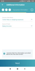 Jadi Transfez akan memberikan opsi untuk apa uang ini dikirim ke luar negeri. Ada beberapa pilihan yang bisa Anda pilih, misalnya saja untuk membayar tuition fees or studying expenses. Transfez juga ingin mengetahui dari mana sumber dana ini berasal misalnya dari Salary (gaji). Kemudian centang box paling bawah.